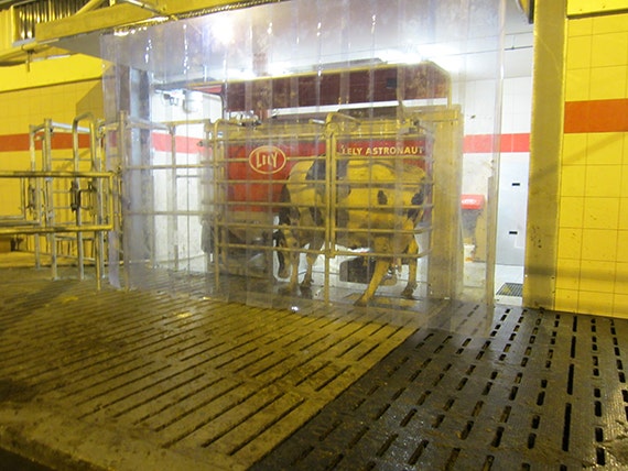 Kunststofflamellen, die rund um die Maschine angebracht werden, sind ebenfalls sinnvoll, um das Einfrieren des Roboters zu verhindern. Allerdings sind sie bei den Kühen nicht sehr beliebt und es dauert eine gewisse Zeit, bis sie akzeptiert werden. Alternativ könnten die Lamellen auch nur seitlich im Bereich des „Schlupf“ und oberhalb des Roboters angebracht werden.